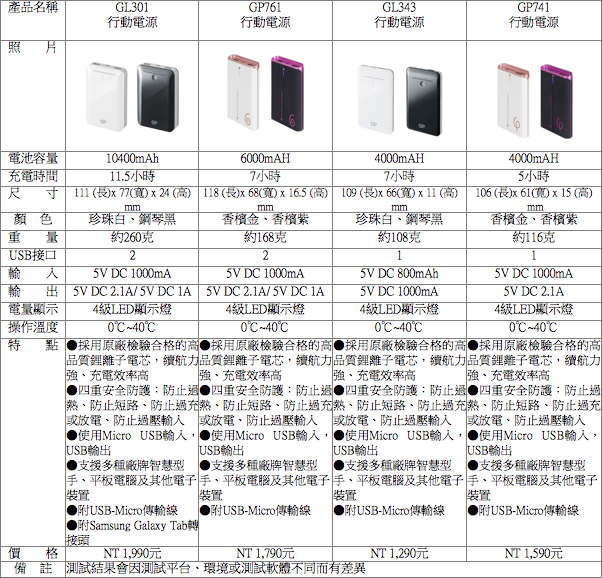 這次【GP電池】共推出GL301、GP761、GL343及GP741四款行動電源。