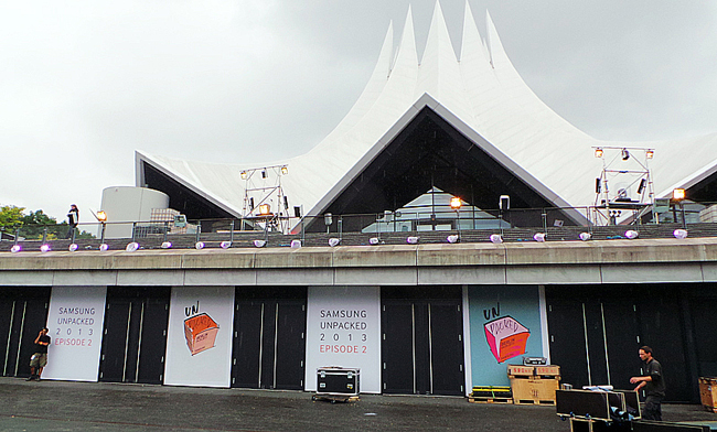 這次最主要當然是要看 GALAXY Note 3 的發表啊!所以前一天就跟著媒體朋友們到會場去看看,迎接 Samsung UNPACKED 2013 的來臨。會場地點跟去年一樣,這個火山造型的外觀好特別!