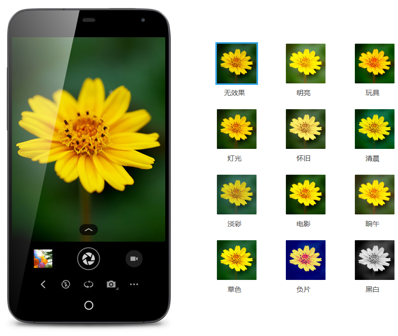 相機部分使用800萬像素的Sony鏡頭,並採用第二代藍玻璃濾光、f/2.0光圈、零延遲拍照技術、第四代白平衡演算法,並具有每秒20連拍的高速快門,可讓拍照功能更犀利。前置鏡頭部分使用200萬像素,也是Sony所製造的鏡頭。