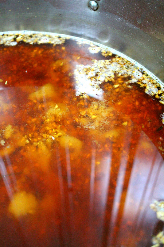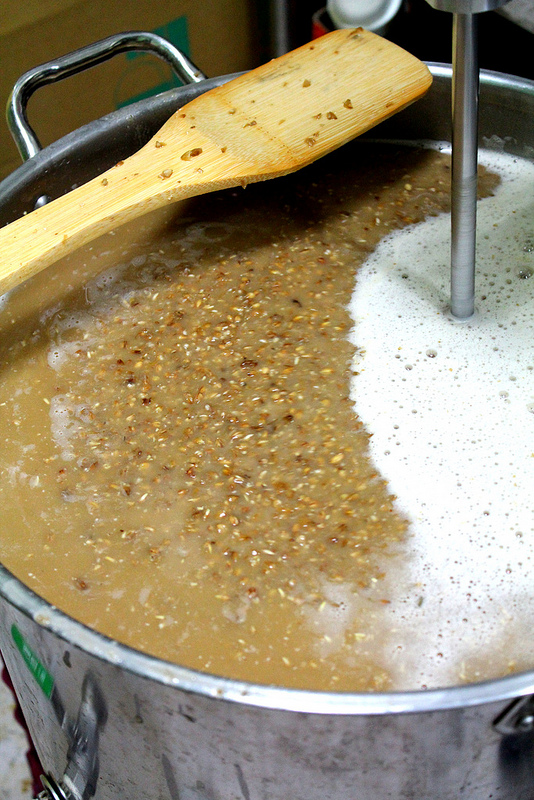 歷經一個半小時才煮好的麥芽,整鍋看起來有點像是燕麥粥,哈哈!稍微沉澱後,就顯現出清澈的紅色麥芽汁液,空氣中也瀰漫著一股麥芽香氣。