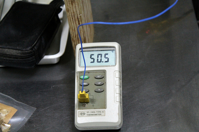 這個階段最重要的就是控制水溫,50℃分解蛋白質、65℃糖化、78℃殺青,前兩段都要耗費約40分鐘的時間,光是進行到這裡就已經過了將近兩個小時。最後,可以利用碘檢法或是糖度計來判斷糖化程度,大丙的糖度計是電子式的,看起來很高級。