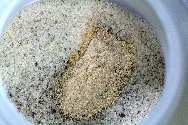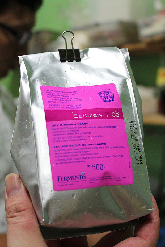 麥芽汁加入啤酒花煮沸後,置放到室溫冷卻後可以再次過濾,接下來就要投入酵母,這回使用T-58高酒精耐受度酵母,用量也是一些些而已,10公克就能發酵上20公升的麥汁。酵母會將糖份轉換成酒精和二氧化碳,過程中分為四個步驟:甦醒、繁殖、發酵、沉澱,幾乎會有一半的糖份被酵母給吃掉了。