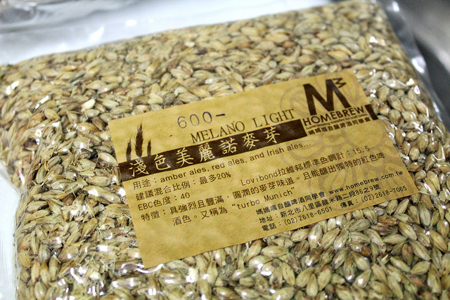我們這次釀造的是紅色啤酒配方,裡面有四種麥芽:Melano、Melano Light、Pale Ale、Pilsen 2RS,總共3公斤的麥芽,搭配15公升的水量。