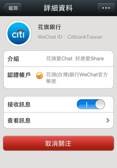 3. 點擊「花旗銀行」,按下關注,點選查看訊息,即可獲得花旗銀行提供給WeChat關注者的好康紅利優惠。