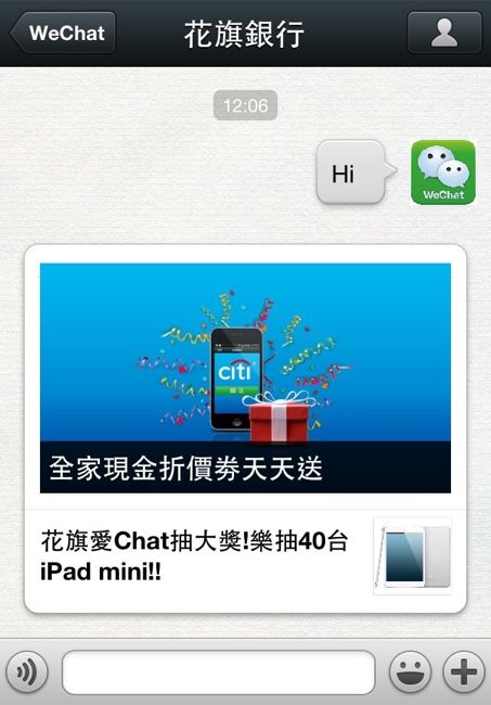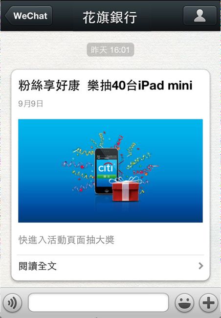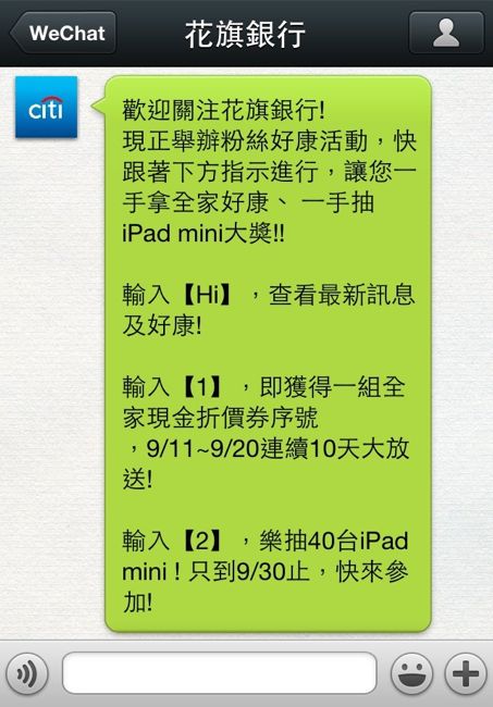 為了歡慶WeChat「花旗銀行」官方帳號正式啟動,花旗銀行推出「花旗愛Chat,好康愛Share」的活動,消費者只要關注WeChat「花旗銀行」官方帳號(WeChat ID:CitibankTaiwan),即可於2013年9月11日到9月20日期間,每天中午12點起,領取序號,參加兌換全家便利商店新台幣50元、30元、10元不等的現金折價券,每天限量5,000份;除了超商現金折價優惠外,關注者在2013年9月底前,在WeChat「花旗銀行」官方帳號(WeChat ID:CitibankTaiwan)上填入資訊,即有機會再抽40台iPad mini!機會難得,趕快行動。