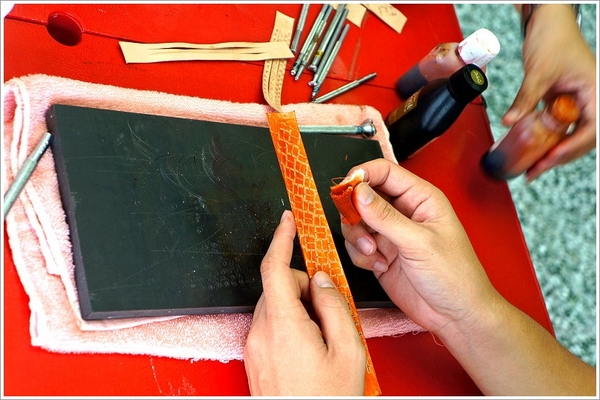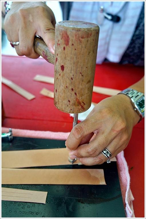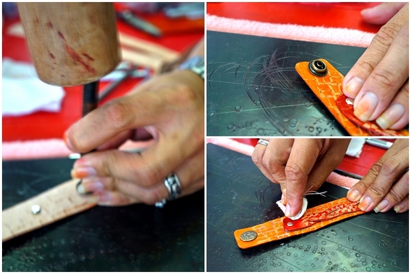 ▲再來還是使用木槌把扣子打上去! (這部分也很有趣阿) 接下來要使用乳液擦拭讓皮革上的色料更牢固!