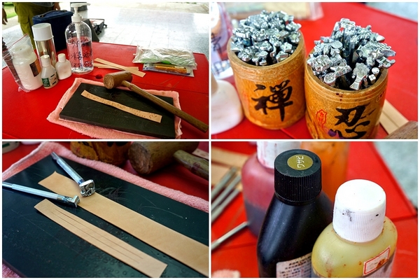 需要的工具除了墊板、槌子外,還有等下需要打上圖案的印模、上色的色料及完工後的乳液等等。