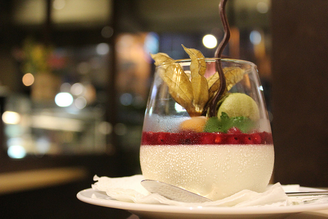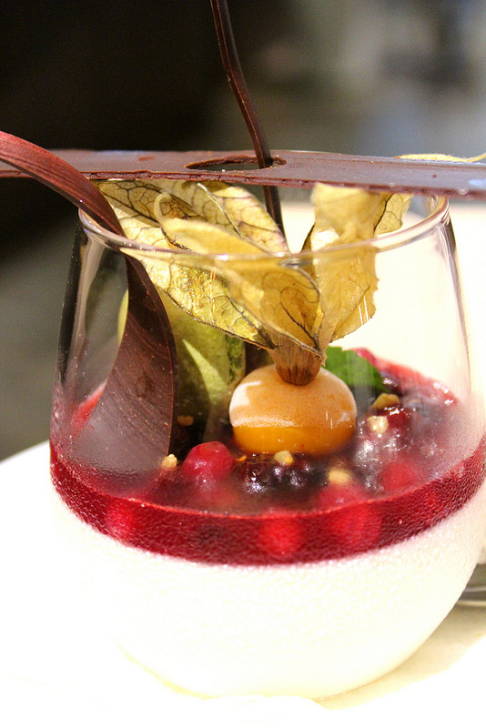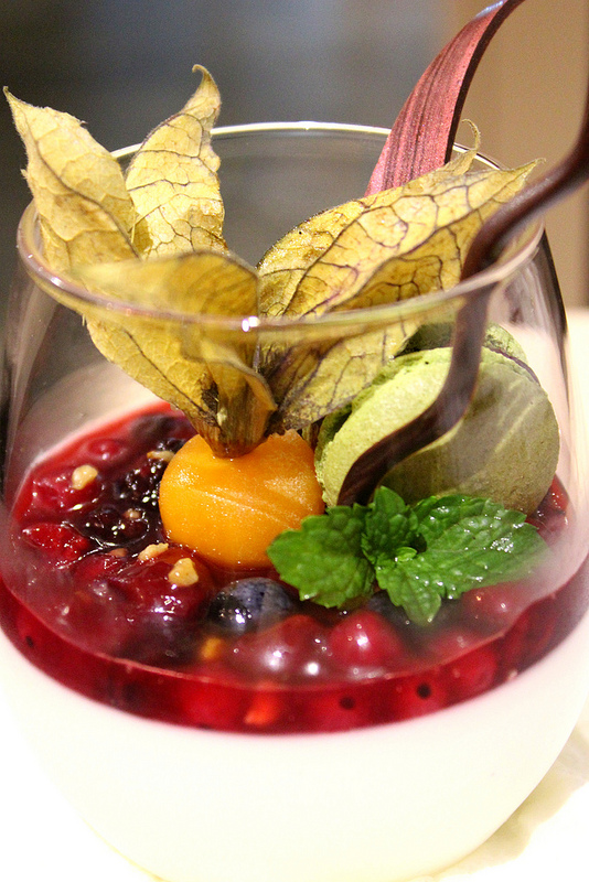 噢噢噢!這麼可愛的盆栽要叫人怎麼動手啊~彷彿從在純白雪地裡長滿著鮮紅莓果樹叢,巧妙的運用燈籠果與綠色馬卡龍、薄荷葉,讓整個更加生機蓬勃,即將融雪迎接春天的到來。最下層的白色奶酪最是好吃,可以嚐到香草豆莢的獨特香氣,簡單卻豐富。大叔真心的推薦這道綜合莓果奶酪給大家~請慢用。