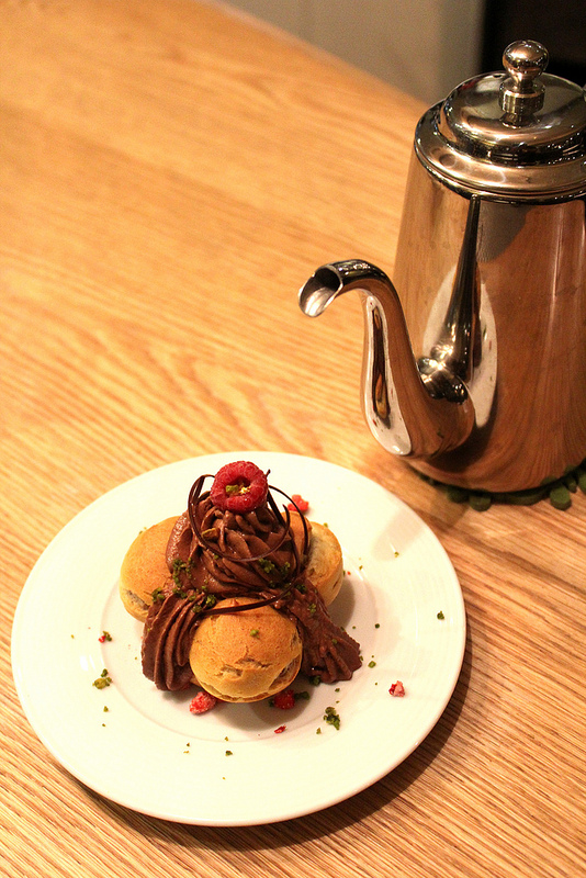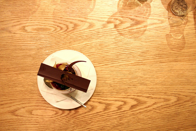 不好意思,接下來大叔必須用好幾張照片來介紹這道莓果奶酪~因為它是我今年吃過最棒的甜點!無論是外型和風味上都足以讓人感動。首先來張俯視圖,小余老闆用了個開天窗的長型巧克力片當作屋頂,讓客人在享用這道甜點的時候,會有種打開禮物的驚喜感覺。
