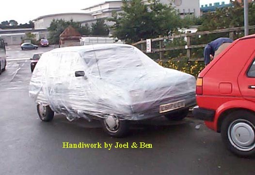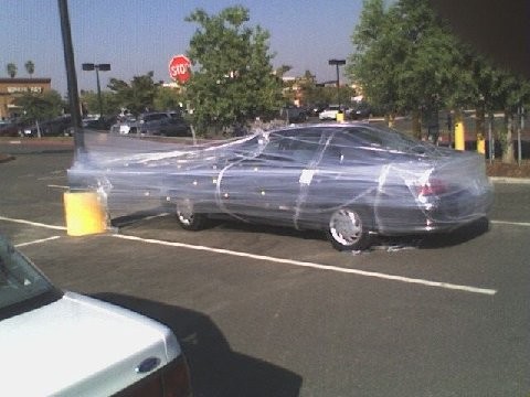 並沒有法令嚴禁這項活動…..畢竟你是把別人的車“包起來”保護的好好的,所以最算被抓到了,也可以硬掰是為了保護你的車子被別人蛋洗,但是如果你是惡整朋友就算了,如果遇到兇惡的車主,還是危險性很高的。