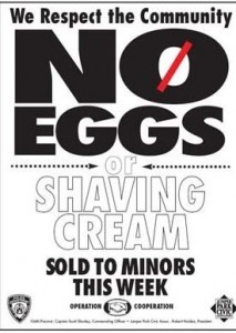 這是社區的宣傳單,請商店不要賣蛋和刮鬍子的泡沫給未成年的人…..這….難道成年人就不會做這檔事嗎?