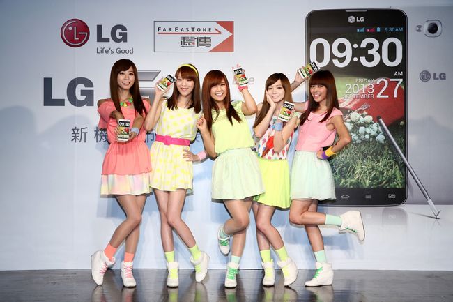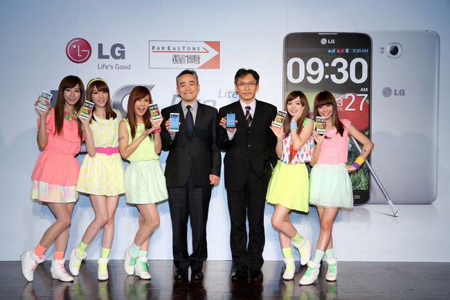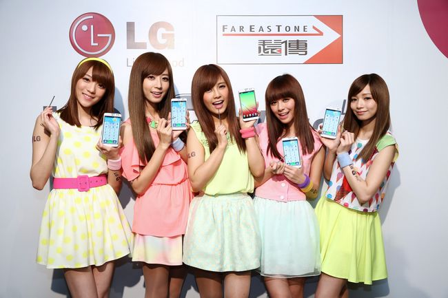 左四起台灣LG電子通信市場行銷部協理金承會,遠傳電信行動裝置管理處副總趙憶南與少女團體Popu Lady合影