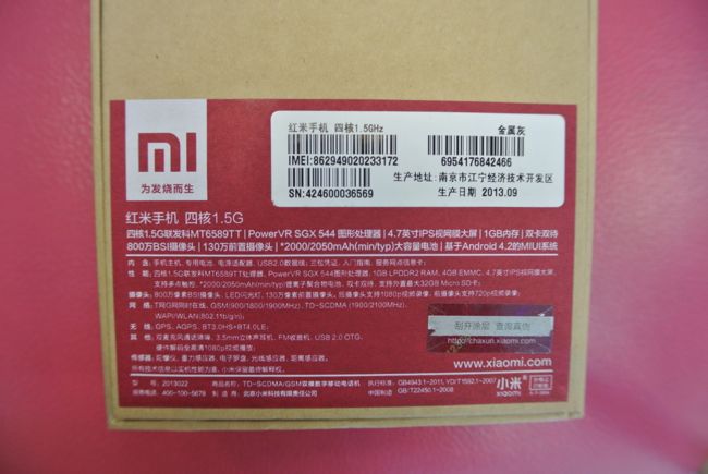 後方有著簡易規格參考。聯發科四核心1.5GHz處理器、4.7″ IPS螢幕、1GB RAM、雙卡雙待、800萬畫素鏡頭、130萬畫素前置鏡頭、2000mAh電池容量、Android作業系統與IMEI序號等訊息通通都列在上方。