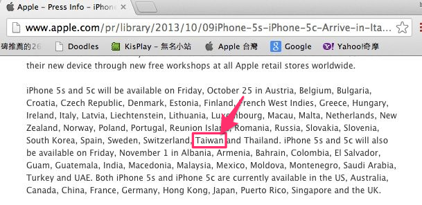 根據蘋果官方新聞稿中表示有著全新指紋辨識功能、雙色補光燈、A7與M7晶片處理器與迷人魅力金的iPhone5S,以及擁有綠、白、藍、粉、黃繽紛五色的iPhone 5C將會於10/25在第二波國家中開放購買,而從其中可以看到令人興奮的Taiwan字樣。