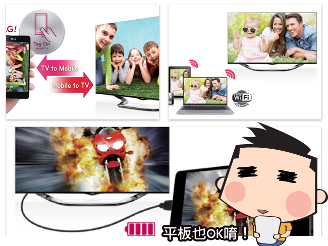 手邊的行動裝置如果能快速連到電視那該有多好,這款 LG Smart TV 鴻運系列電視內建了多元化的數位連結技術,像是 MHL、Miracast、WiDi、Tag On(NFC 技術)…,讓我們不管是從手機、平板或是個人電腦,都有辦法直接在電視上呈現,甚至還能雙向傳輸,讓你的行動裝置變成第二台隨身電視,真的滿厲害的!