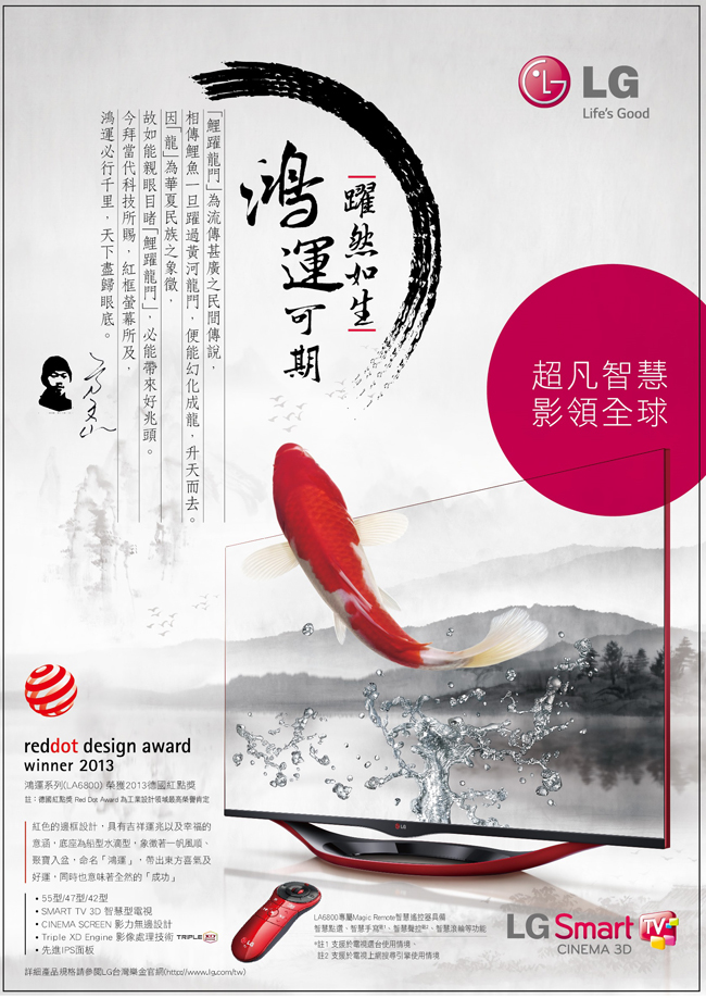 外觀設計上就很厲害了,像恰阿嬤說的台語:「紅水黑大扮」,這款 LG Smart TV 鴻運系列可以說是完全中了這點,像是紅框螢幕、船型底座都採用紅色的設計,和螢幕整個就滿搭的,得過這次 2013 德國紅點設計獎喔!