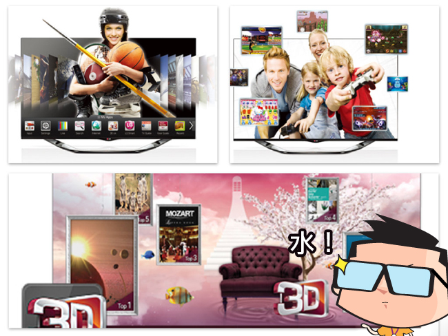 這年頭出了一堆的 3C 產品,大家都各玩各的,只有電視可以把家人都連結在一起,一起坐在客廳。其實 LG Smart TV 就已經幫大家準備好很多豐富的內容和 App 應用程式,在家看看 3D 影片、玩互動遊戲,LG Smart TV 可以讓我們趁空閒時間,陪家人一起體驗一下家庭娛樂囉!