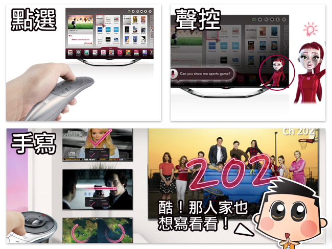 其實這款 LG Smart TV 鴻運系列電視除了在外型上很有特色之外,我們最主要還是要「看電視」吧!裡面最吸引我的智慧型電視三大功能:Smart Control、Smart entertainment、Smart Sharing,讓電視更看、更好用、更貼心兒~