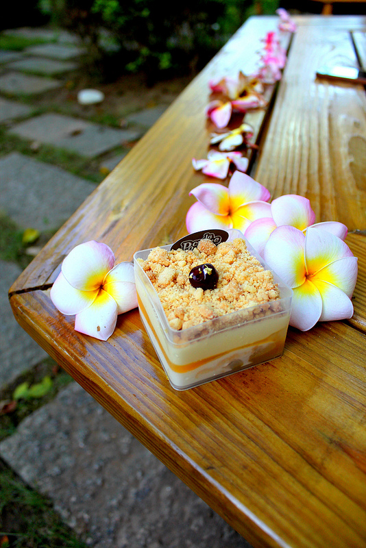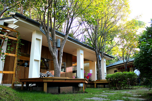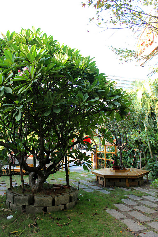 選好甜點蛋糕結完帳後,就可以到庭院座位區享用嚕~這裡原本是隔壁大宅院餐廳的一部分,現在規劃成小口帶甜品的座席。有株頗為茂盛的雞蛋花,正值花季末所以不少落花在地上,調皮的日本小女孩仔細的把它們給排成一列。