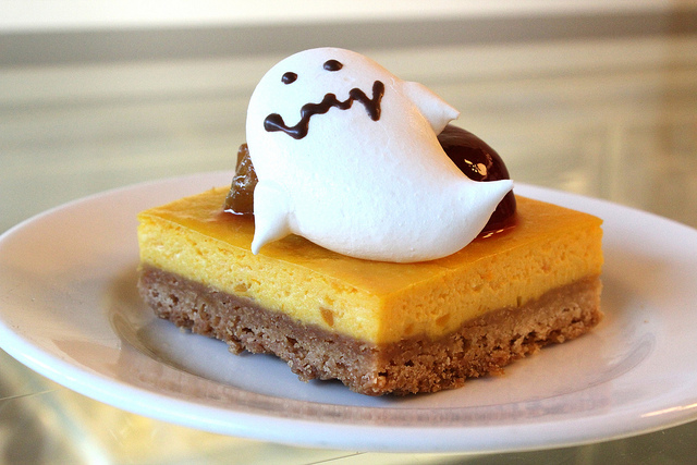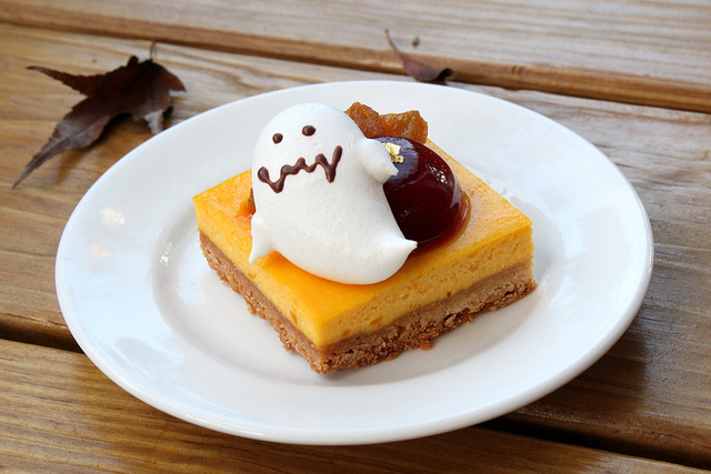 南瓜驚魂夜最下層是口感酥香的餅乾層打底,再來由南瓜餡為主軸,上面佐以蜜地瓜、蔓越莓凍,最後再放上可愛鬼造型的蛋白糖霜。