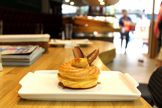 臻果巴黎布蕾斯特(Hazelnut Paris Brest),這道有著螺旋狀外型類似泡芙口感的甜點,據說是在1891年時,法國舉辦由巴黎出發抵達布列斯特後再返回巴黎,這趟長達一千兩百公里的自行車大賽,有位麵包師傅就以車輪轉動時的形狀為發想,創造出這道傳世百年的經典甜點。