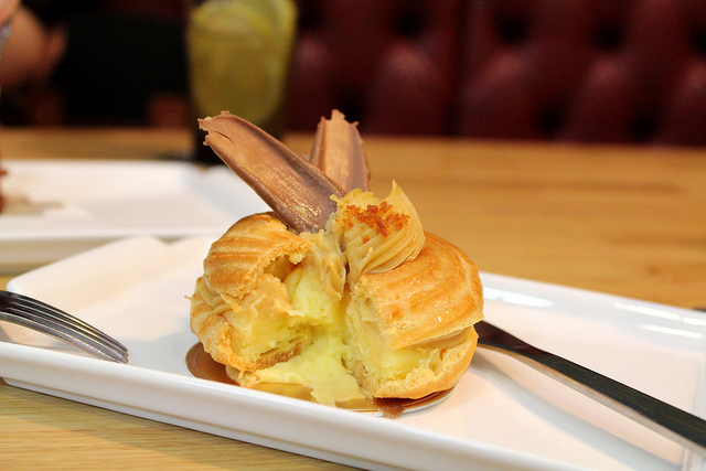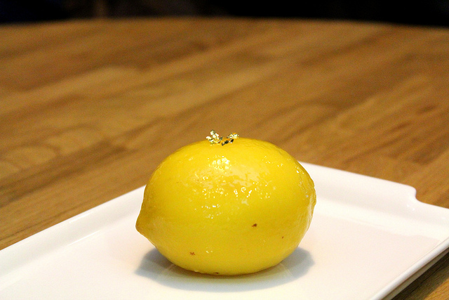 最後託咱們板橋區美食里榮譽里民 Irene 的福氣,嚐到這今天最後一顆的糖漬檸檬!據說由於新鮮且品質好的檸檬採買不易,加上製作過程費時,這個最好事先預約才比較吃得到,不然剛上架就會被搶購一空,整顆檸檬被挖空之後再填入卡士達醬和葡萄柚,連皮都可以一起吃唷~