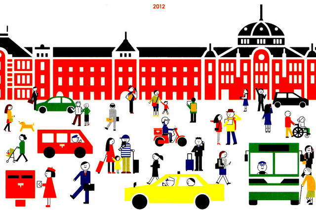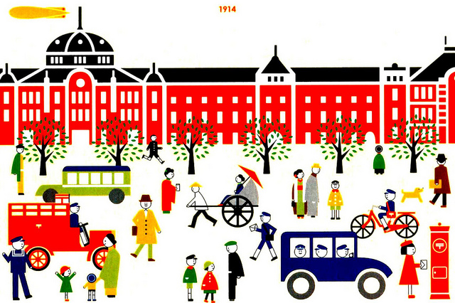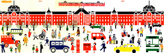 所以收到的其中一張明信片,是紙張偏黃懷舊風格的1914年東京車站,從穿著到交通工具,甚至是右下角的郵筒,都反映出當時的東京生活。房辰野金吾先生所設計的東京車站丸之內側站,在二次大戰時曾毀於燒夷彈空襲轟炸,數十年來歷經火災、修復、新建、都市開發等工程與爭議,終於在2007年時展出復舊工程,2012年順利完工,並同時啟用東京車站旅館。