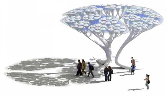 名為「TREEPODS」的人造光合樹仿自「龍血樹-cinnabari」,全球最珍貴的品種就生長於葉門索科特拉島,甚至連錢幣都有龍血樹圖案;龍血樹壽命可達數百年,本身具高經濟價值、可提煉藥品、染劑、化妝品、亮光漆;葉可舖於屋頂、製成繩子、開花時蜜蜂採其花蜜為市場價格最高、品質最佳、樹幹也可當燃料。