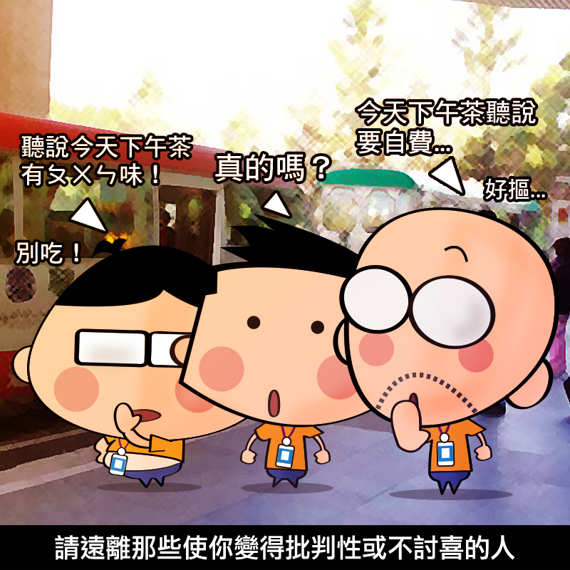 沒有人是完美的。任何對他人的批評也是不應該的。同儕間工作之餘最常講的就是八卦,就算不參與其中,聽久了也會讓自己變成一個易批判別人的人。這樣的人,很容易忽略別人存在的價值。如果能正面了解這些不同生活和裝扮的人,會發現在一生中你能遇到的以及能學習的人事物多到不可思議的!這些機會是要自己去爭取的,不是靠批判別人或打壓別人,就能提升。