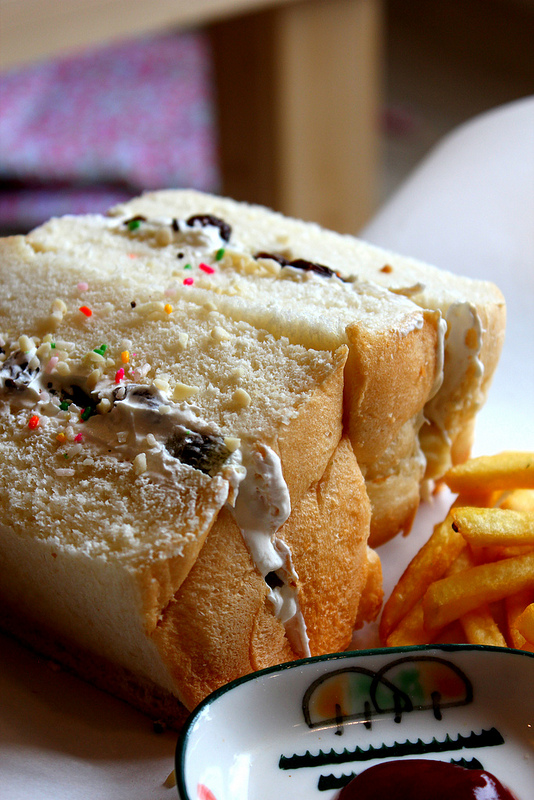 粉雪水果三文治,這個就真的很不推,香蕉跟奶油的組合真的有點膩口,加上彩色巧克力米就更讓我開心不起來。