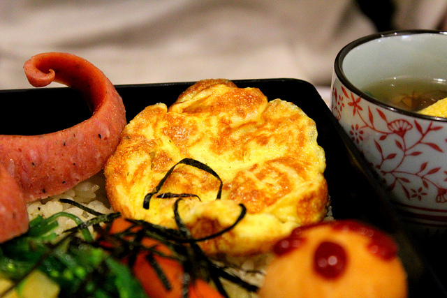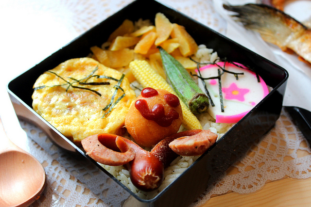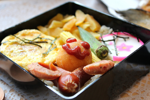 厚煎蛋、玉米筍、秋葵、魚板、熱狗、團子,就是個日式便當啊!可愛捏~