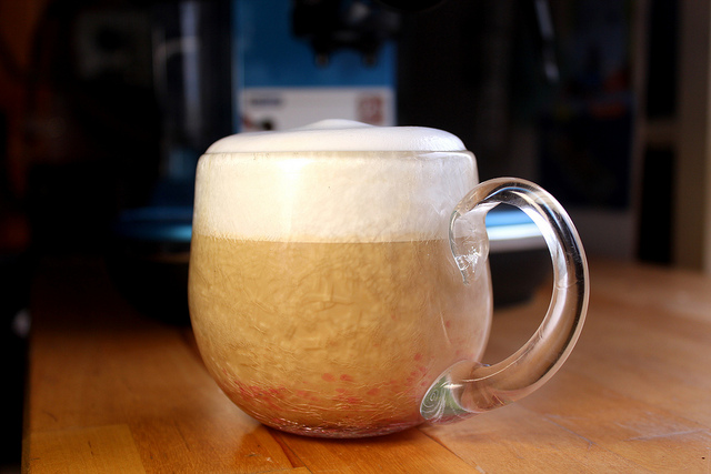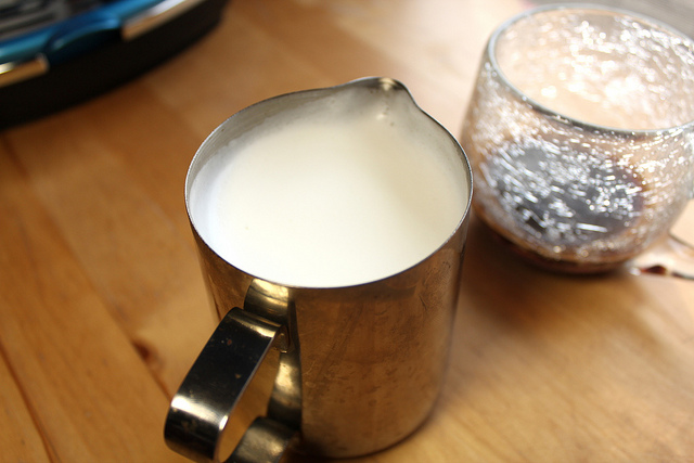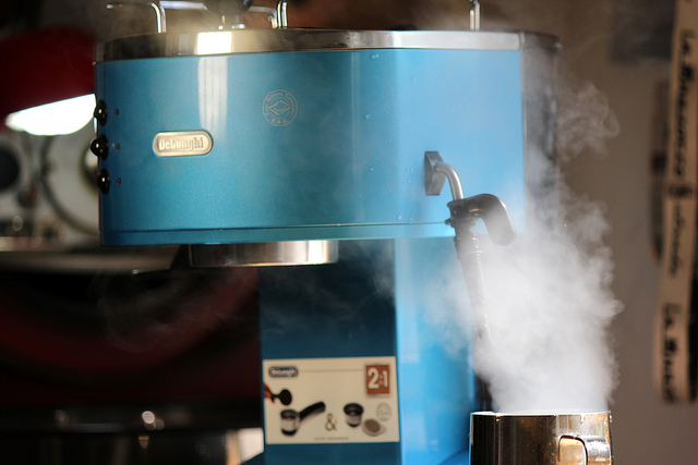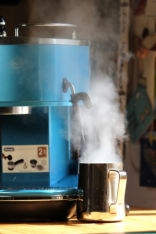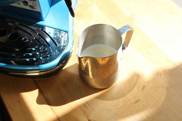 加熱很簡單,困難的在於發泡的技巧,奶泡加熱管別插的太進去液面下方,大約是在1~2公分處就好,可以聽見牛奶嘶嘶作響的聲音為佳,並且讓牛奶呈現旋渦狀旋轉,這時就會產生大量的泡沫。如果奶泡加熱管太淺,則會產生粗糙的泡沫,要適時的調整,並用右手感覺鋼杯的溫度。