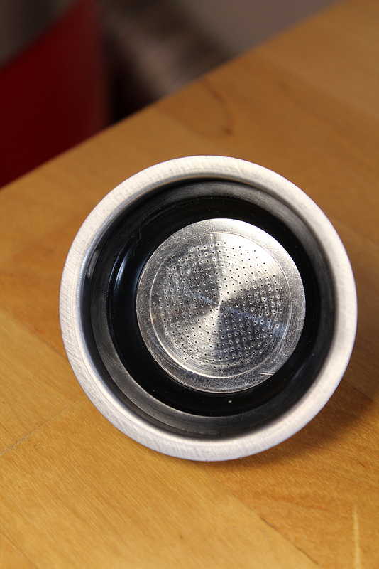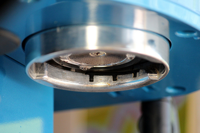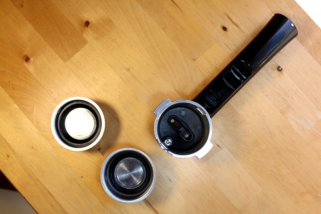 直接向上頂在機器左側的簡易填壓器,或是添購專業用的Tamper填壓器,這個濾杯的口徑大約是50~51mm的,要稍微拿去合一下看看。有個小技巧可以讓你填入更多的咖啡粉,就是先裝滿濾器後,再輕輕的用把手敲擊桌面,這樣咖啡粉會變的密實,你就可以再加一些進去。