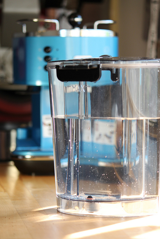 Delonghi 義式咖啡機的給水箱有個聰明設計,裡面有水也可以拆下來唷!建議使用過濾後的可生飲水,或是煮沸過的開水。