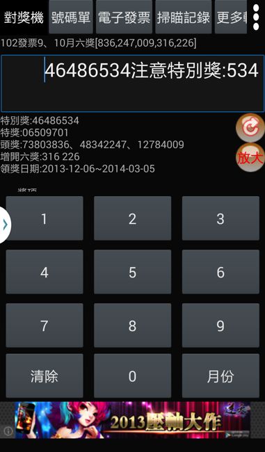 從畫面就可以看得出來,相較於剛剛單純對統一發票的i統一發票,這款app就熱鬧了許多。不只有統一發票一個對獎選項。舉凡大樂透、威力彩、五三九等等跟彩券有關的開獎資訊通通應有盡有。同樣也有提供”對獎”欄位讓使用者可以手動輸入號碼後三碼來進行對獎。