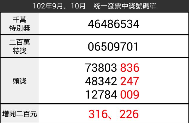 今天(25日) 下午2:00,財政部就為大家公布102年9-10月的統一發票中獎號碼,除了多一組200元的三碼以外,這次也有千萬獎金的中獎號碼-46486534唷!
