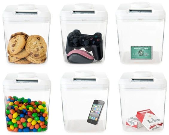Kitchen Safe Uses Time Lock 是一個有機關的保鮮罐,尺寸6 ×6× 6.5英寸(寬x長x高),一個方形的罐體和一個大型的頂部開口。這容器材質與一般廚房的保鮮密封罐沒兩樣,但是它絕不像廚房的保鮮密封罐可輕易打開,它的上蓋安裝電池保持電源開啟,可以上鎖,用密碼解鎖,不過不是光知道密碼就可以解開,它還有定時設定,待時間一到,才可以密碼解鎖。若自知時間快到即將可以解鎖,它會進入倒數五秒讓你有時間改變心意,可在這五秒時間內繼續上鎖。
