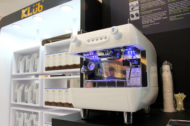 這台有著珍珠白鋼琴烤漆般亮眼外型的,是由誼丰精機所製造的 KLUB RF1 單孔義式咖啡機,過去幾年世貿咖啡展都以鮮茶機為主力的這間公司,今年主推的是家用市場接受度高的單孔機,末端售價平實近人,展場價是連大叔都心動不已的三萬八千元啊!