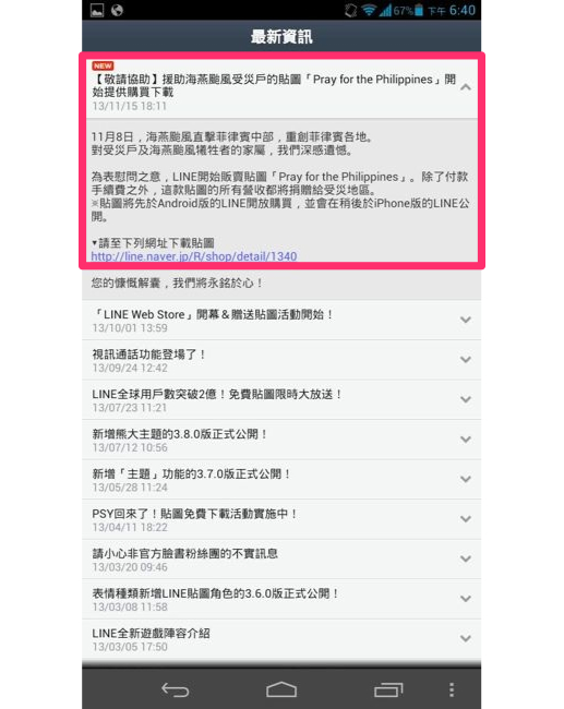 這系列”Pray for the Philippines” 貼圖共有八張,Android使用者只要使用50金幣購買後,LINE將會扣除付款手續費後,這款貼圖的所有營收將會捐贈給受災地區。