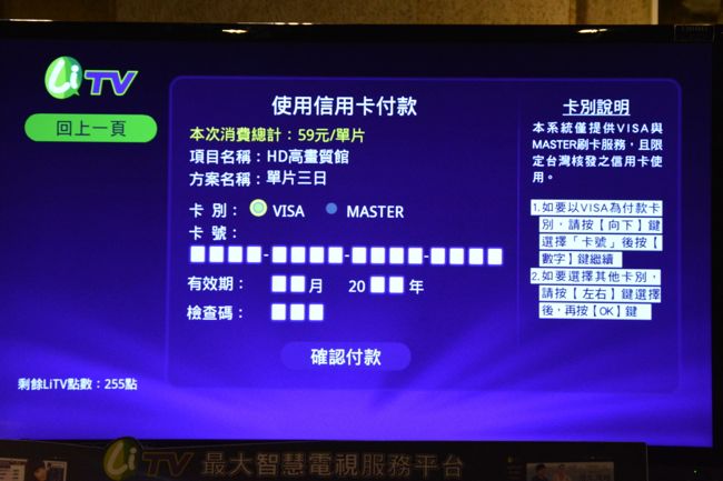 倘若看到喜歡的影片,使用者也可以先看預告後再決定要不要繼續購買。購買方式除了透過客服ATM轉帳,還能夠利用直接用遙控器輸入信用卡帳號來進行扣款。