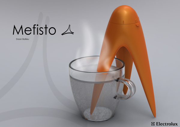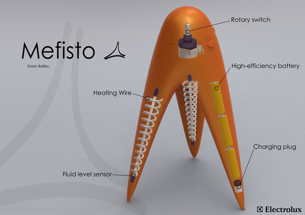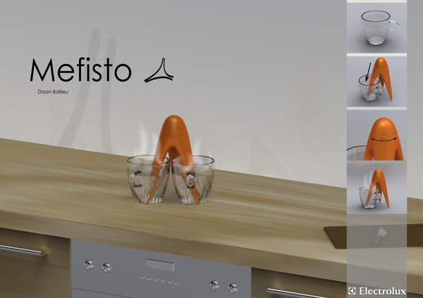 一般的家庭使用熱開水時,會將生水倒入熱水瓶或水壺加熱飲用,同時一定也有發生過加熱飲用後剩下的水沒喝完,持續保溫,最後可能把水倒掉或是重覆加熱的情形,Mefisto的設計目的即是在這微小的能源損耗上做改變,它是一個便攜式的飲用水加熱器,放入水杯中即時加熱,即時加熱並飲用,控制水與電源的使用量。