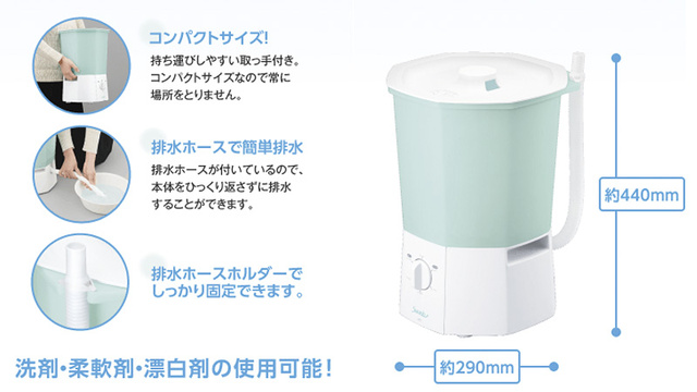 這台迷你洗衣機外觀有點像果汁機,因為體積限制,僅能清洗清便衣物,例如輕薄的夏天衣物或是襪子還有抹布。清洗前,填沖清水與洗劑,會使用五公升的水,一次清洗時間約15分鐘加上3分鐘的沖洗,清洗後的水由水槽的排水軟管排出。