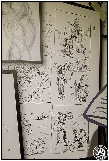 接下來這一區比較特別,它是老夫子50年來的傳承、演變和進化,當中除了許多畫具放大的道具外,牆上也掛著許多兩代王澤的漫畫手稿是為第七區:漫畫工作台(Walking On The Desk)