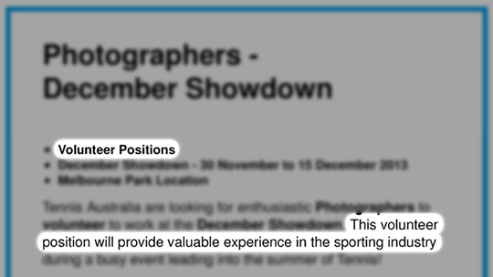 最近澳洲網球協會刊登了一則招聘攝影師的廣告,工作時間由11月底到12月中,主要工作是拍攝運動員,比賽與其他相關人物,當然也開出了應徵條件,包含須有相關經歷或是攝影科班,需要靈活運用PS,自備相機等條件,聽起來其實不算是輕鬆的工作,大家一定很好奇,那薪水是多少錢 ?