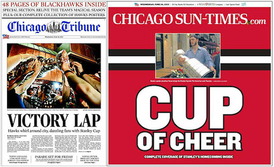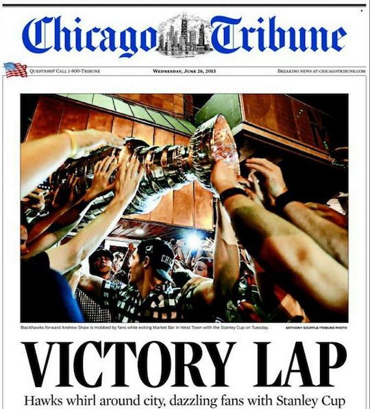 口說無憑,我們直接看看某天的頭版新聞。這則新聞是當地的NHL職業冰球隊伍Chicago Blackhawks獲得總冠軍,對區域性的報紙來說,這已經算是一則重大新聞,接下來請看一下芝加哥太陽報的頭版照片。
