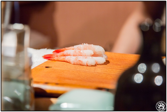 坐著做的檯前因為近且高度較低,是以師父的每一個動作都可以看的清清楚楚,就連每一份食材的鮮度都可以一覽無遺。拿出這蝦子時我以為要做甜蝦握,結果卻不是。