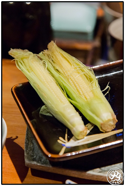 除了檯前的主師父外,後面還有一位師父負責烤物和其他料理,這時他端上每人兩隻「玉米筍」還附上一點點「鹽」不過我全沒沾食,因為單吃就夠甜夠好吃了。