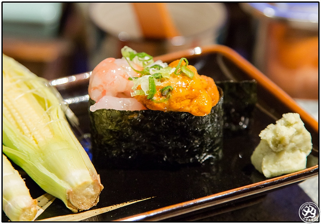 甜蝦+馬糞海膽軍艦卷。這一貫初入口我感受到的是海苔片的脆度,不會過濕帶著討喜的海苔香,隨著泯開海膽後大量的甜充斥著口腔,這海膽夠好吃而且完全沒有腥味,初初蝦子的甜度有一點出不來,但卻提供了一點點微稠微甜的口感,直到海膽的甜跑光了,蝦甜才跟醋遲到而至。
