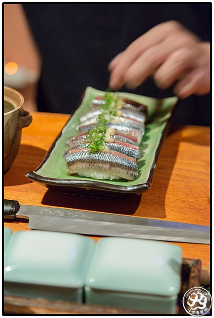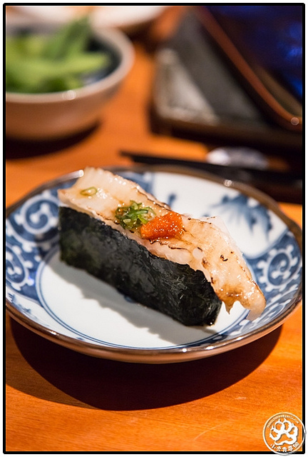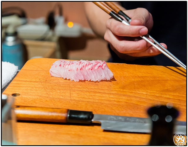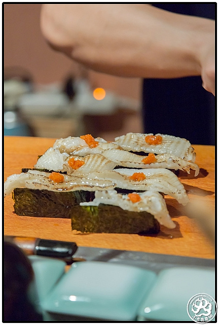 接著師父在準備比目魚緣側的過程,我和food for die兩眼就沒離開過魚片,特別是師父用火炙著魚片時,小虎企圖把鼻孔撐到最大化,就想把其他七貫的香甜全給吸光。