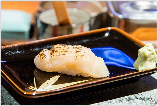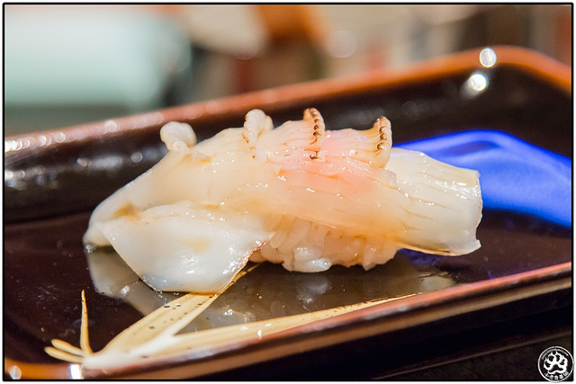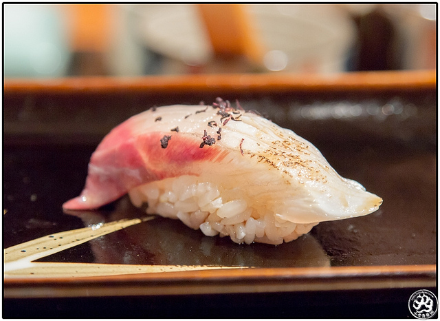 這一貫光看照片不曉得有沒有人會猜是貝類?但其實他是片薄的花枝,經過輕微的炙燒,在醋飯間放了一點點漬過的蘿蔔泥。整體嚐來它沒有太多我愛花枝的粘稠口感,但甜度卻相當的夠,連著若有似無的醋飯乳化效果和討喜的微酸,也算是中規中矩的一貫,這時我發現涮上的醬汁略略偏甜,然後醋飯略濕了一點點。